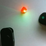 In the image above, the two on the left are green gummy bears, and the two on the right are red gummy bears. The black thing is a laser. The dot on the black laser tells you what color the laser light is, so the laser on the far left is a red laser shining on a green gummy bear. Do you see how the light is really visible out the back end of the gummy bear in only two of the pictures? What does that tell you about light and how it gets transmitted through an object?